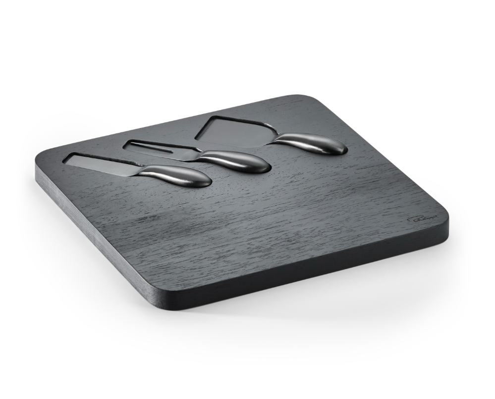 Dieses Käsebrett kommt mit drei speziell gestalteten Messern für Hartkäse und Weichkäse. Die Servier-Tools sind übersichtlich in einer gefrästen Rille angeordnet und stets griffbereit. Bei Nichtgebrauch können die Messer platzsparend im Brett verstaut werden, indem es einfach gedreht wird. Diese praktische Aufbewahrungslösung macht das Brett auch zu einem optischen Highlight in der Küche oder im Esszimmer.
