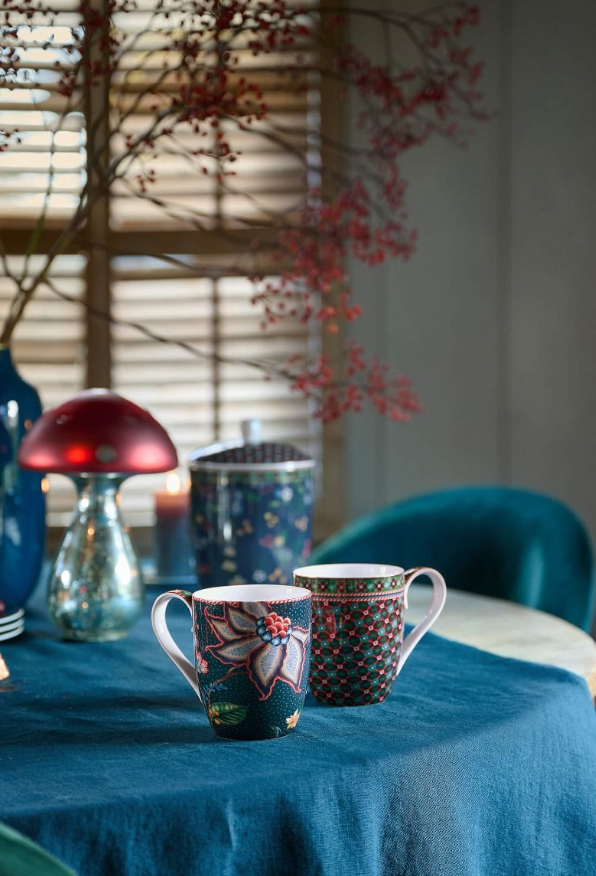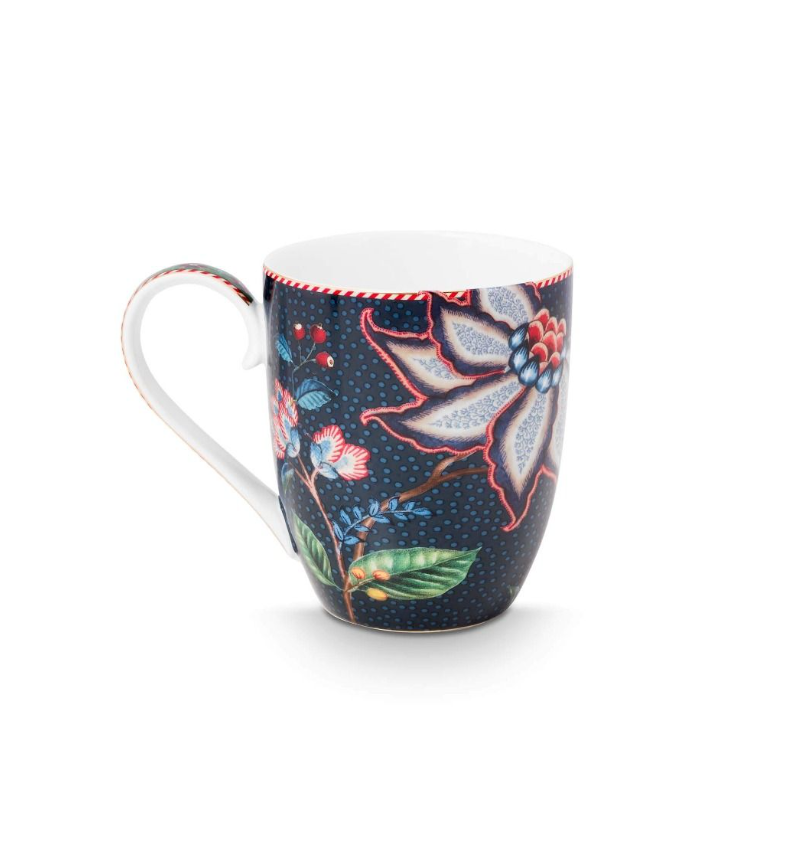 Die dunkelblauen und dunkelgrünen Farben verleihen der Tasse eine sehr warme und elegante Ausstrahlung. Die Tasse ist mit einem dunkelblauen Blumenmuster verziert, auf dem elegante Fantasieblumen und Beeren wachsen.
