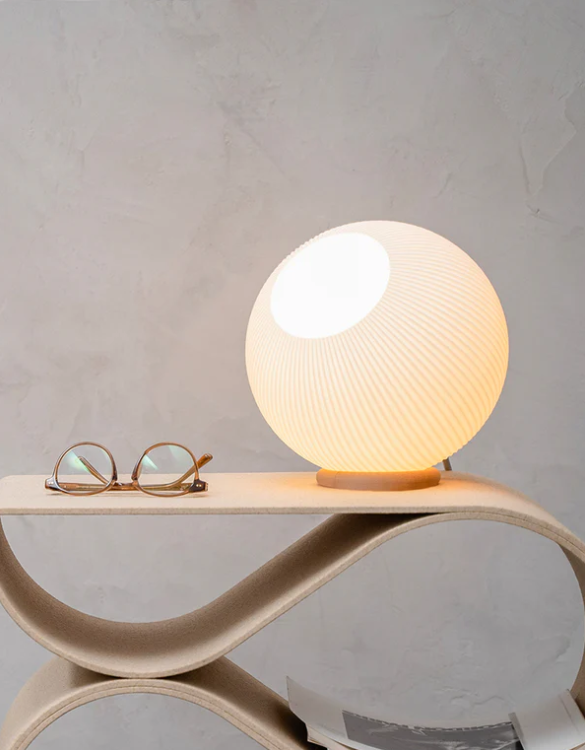 Dekorative Tischleuchte aus recyceltem rPLA mit Glaseinsatz